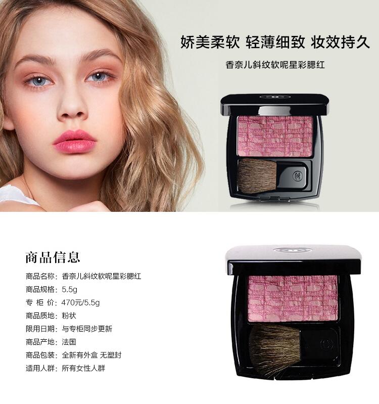使用香奈儿斜纹软呢星彩腮红配以紧颜焕采粉底液和紧颜焕采遮瑕乳,带来理想妆效。