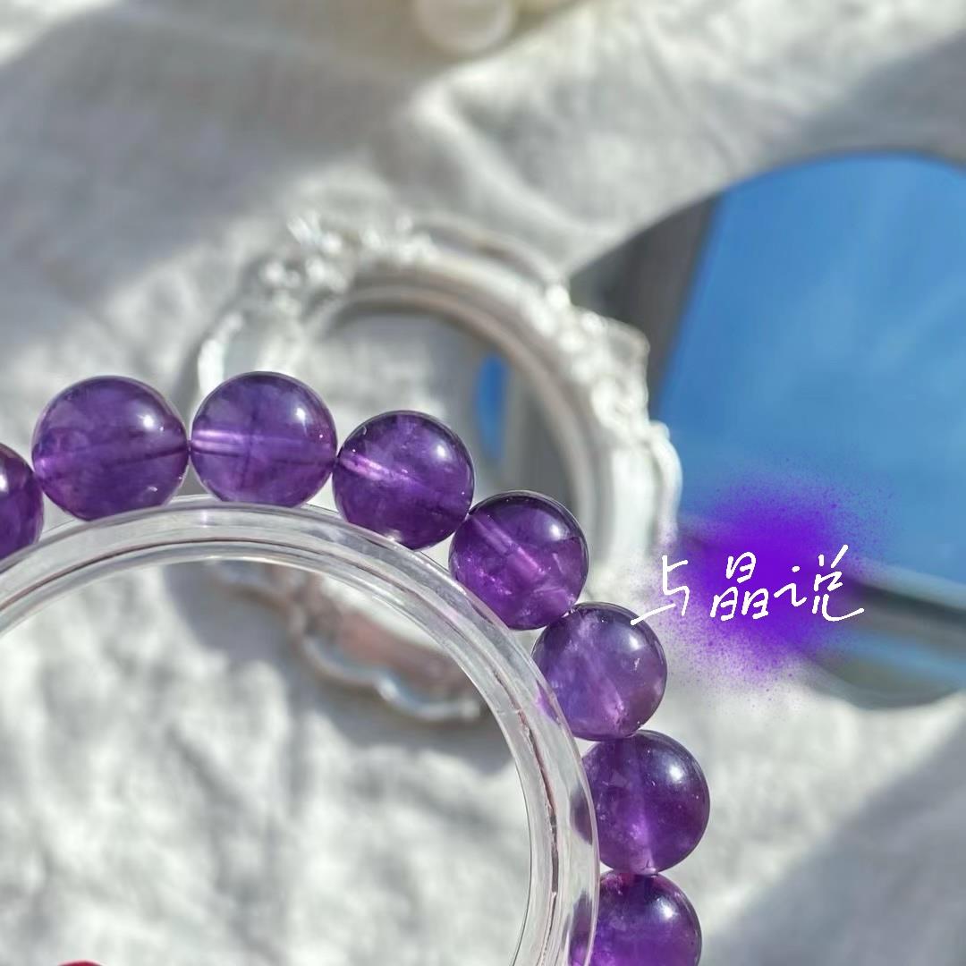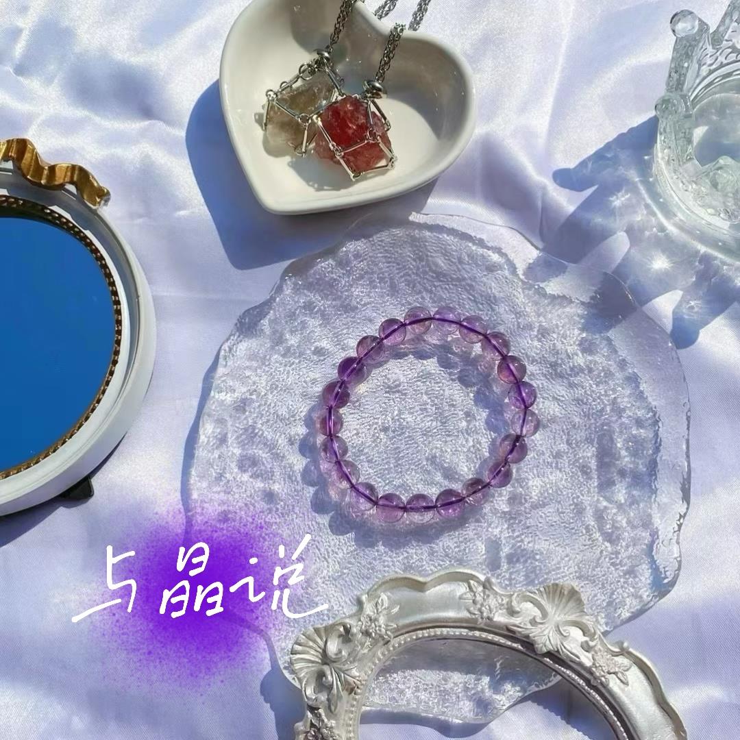 它是不期而遇的梦境,是晨曦未散时最后一滴露珠的化身。光线流转间,晶体深处漾开层层涟漪,宛如被晚风拂过的薄雾,或是诗人搁笔时那一瞬的沉吟.每一道天然生长的纹路,都是大地写给岁月的信笺。佩戴它时,仿佛能听见远古的潮声——那些关于勇气、灵性与爱的古老隐喻,正以沉默的紫,在你腕间低语。