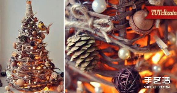 利用树枝自制圣诞树,点缀以暖色调灯,为家中增添圣诞氛围!