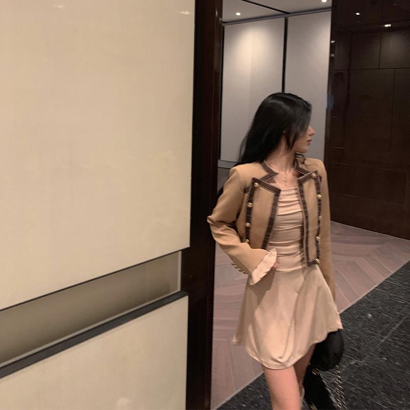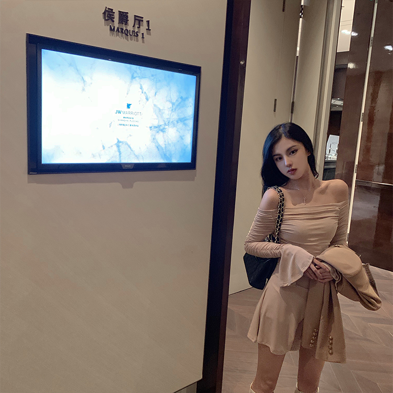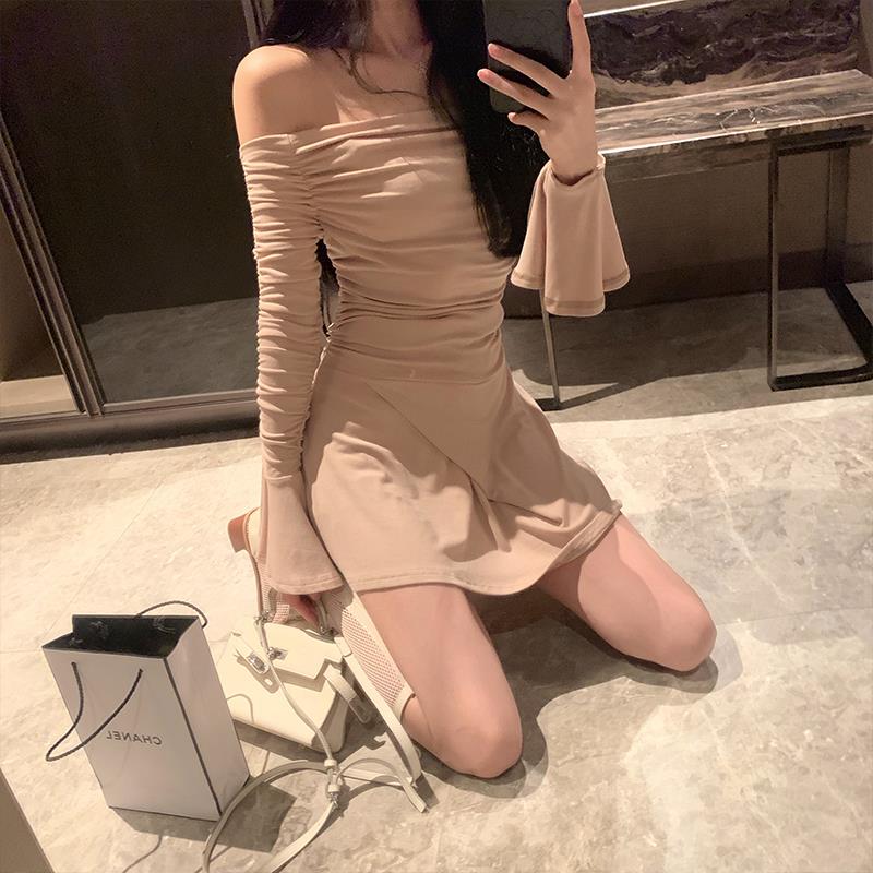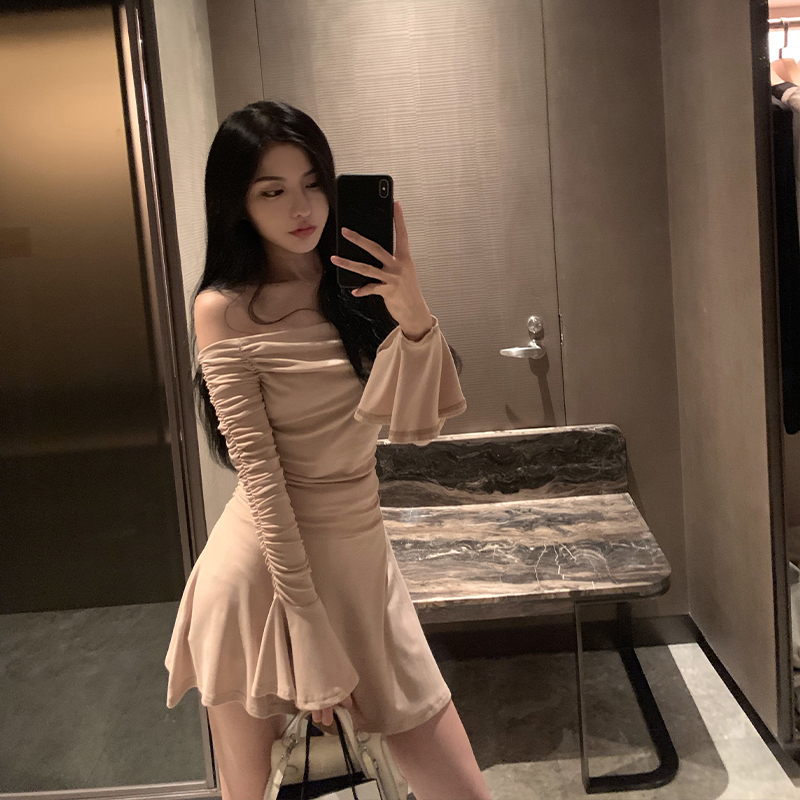 动漫周边 > 服饰 > OKMA 一字肩连衣裙女2020秋季新款收腰显瘦气质褶皱A字裙性感裙子
