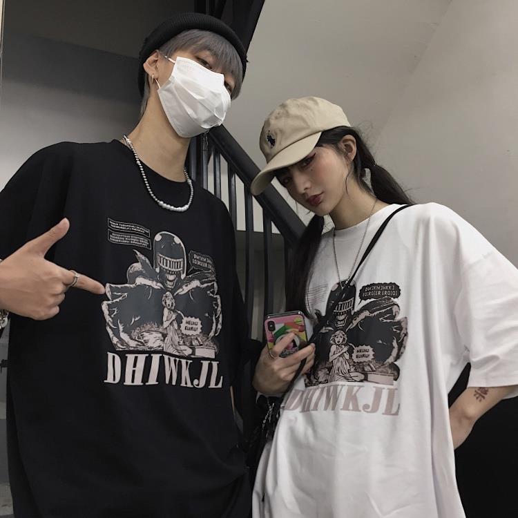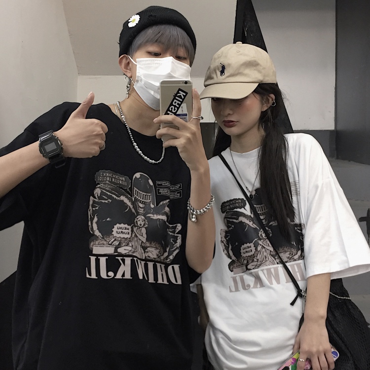 原创暗黑风ins高街救救公主印花颓废丧系宽松短袖情侣装t恤男女潮