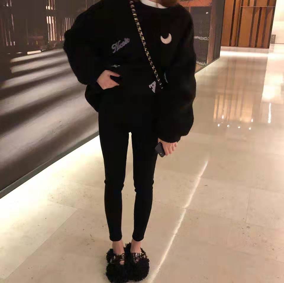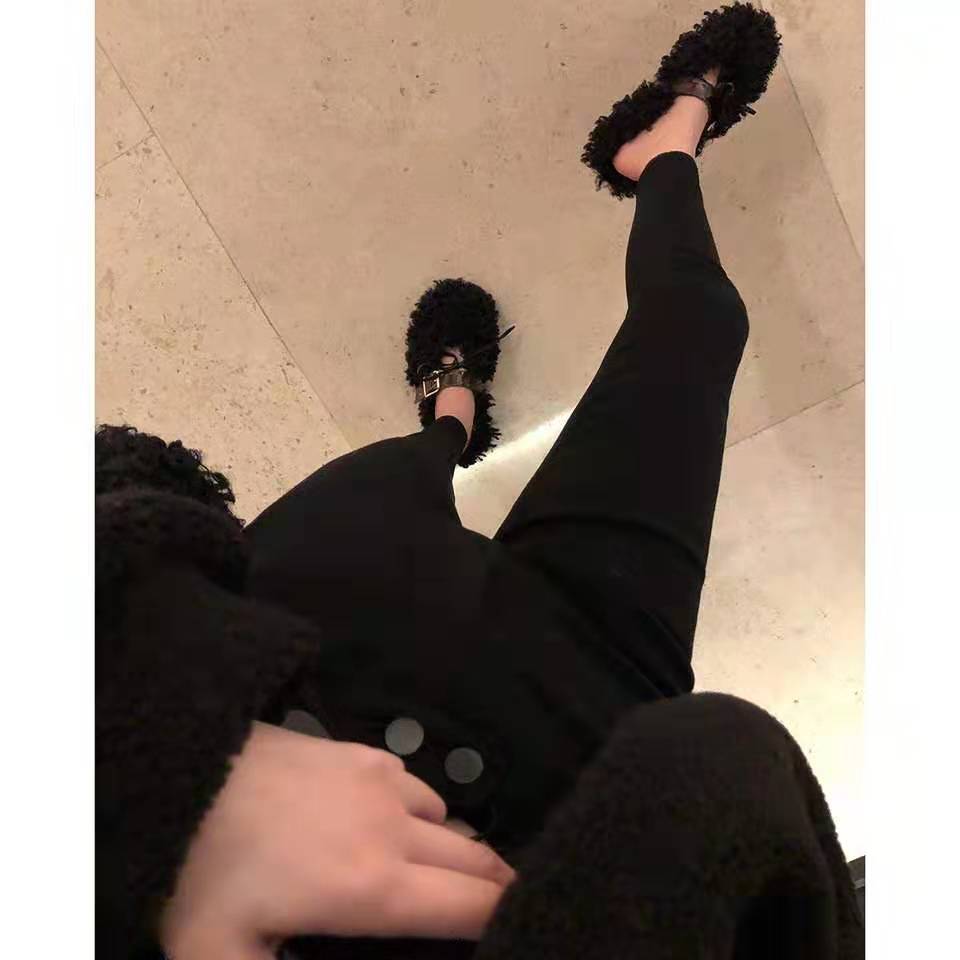 黑色百搭小脚裤来了,内里加绒,非常保暖,高腰的版型,拉长身材比例。小脚裤版型可以修饰腿型,裤子是有弹力的,上身不紧绷。九分的设计可以露出脚踝,非常时髦!~