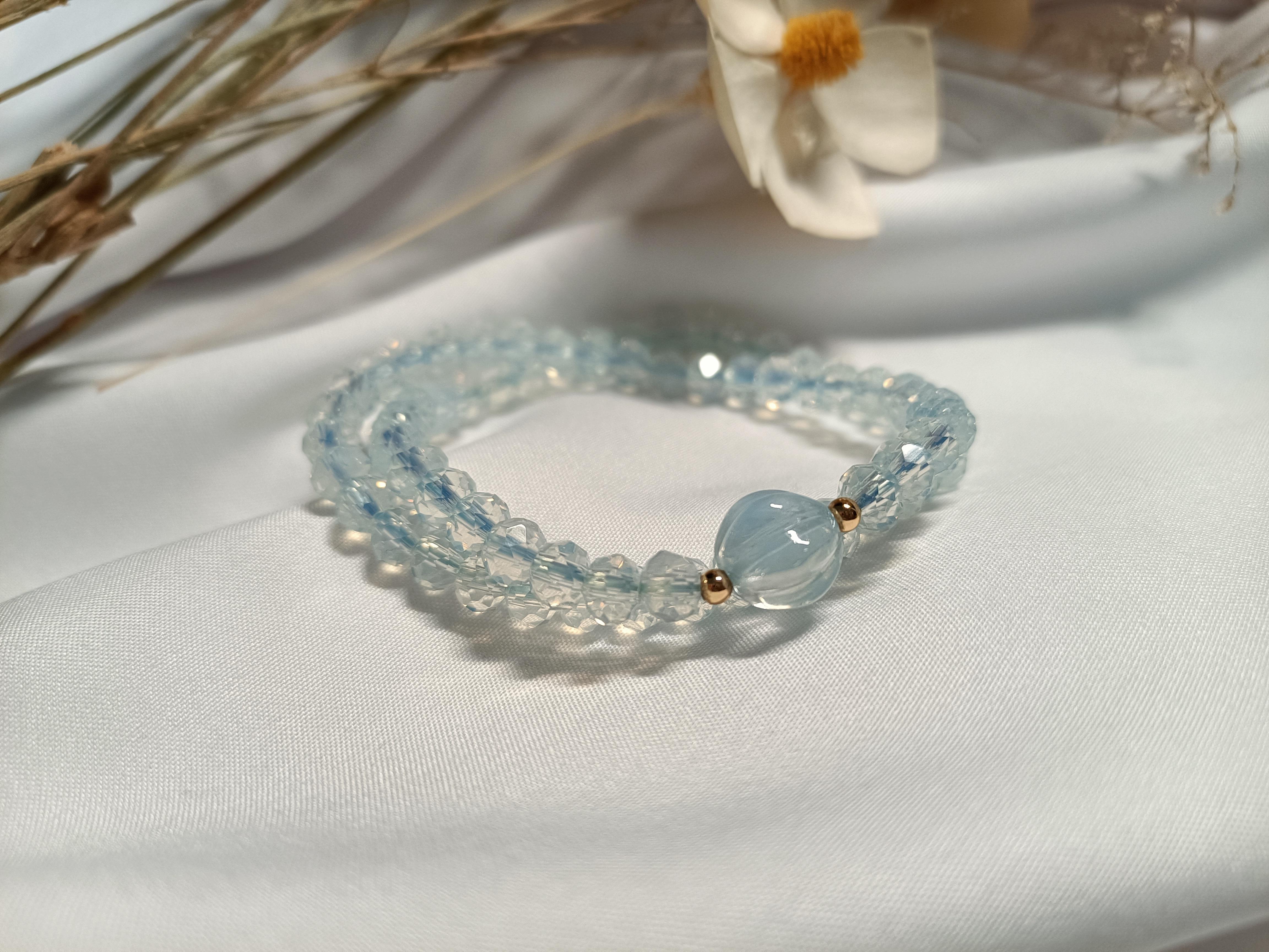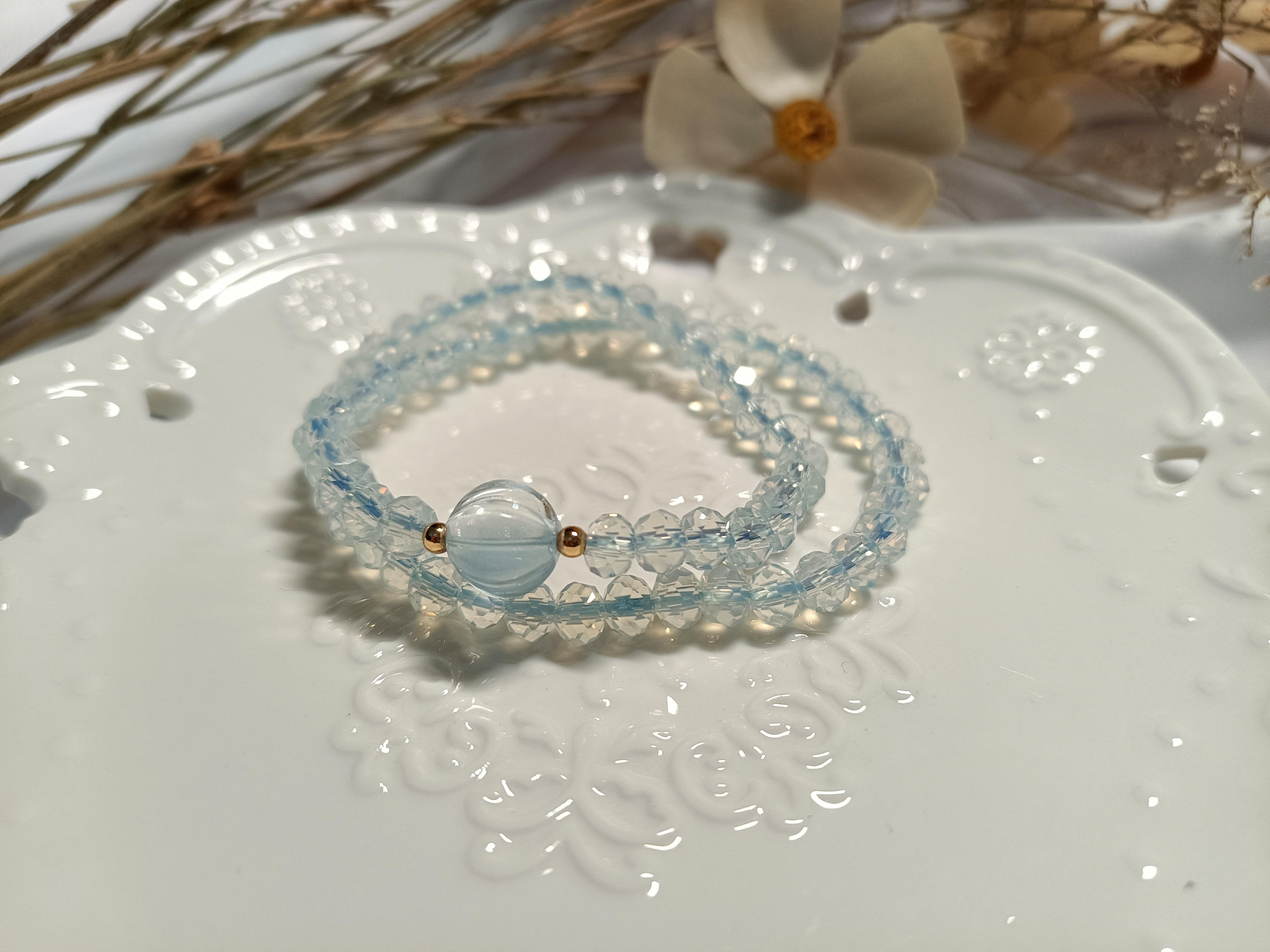 淡淡的蓝色并不张扬,显得十分淡雅,是日常出门搭配的不二选择,透明的蓝色在腕上显得肤白晶莹,衬得整个人有一种阳光下干净清冽的意味。