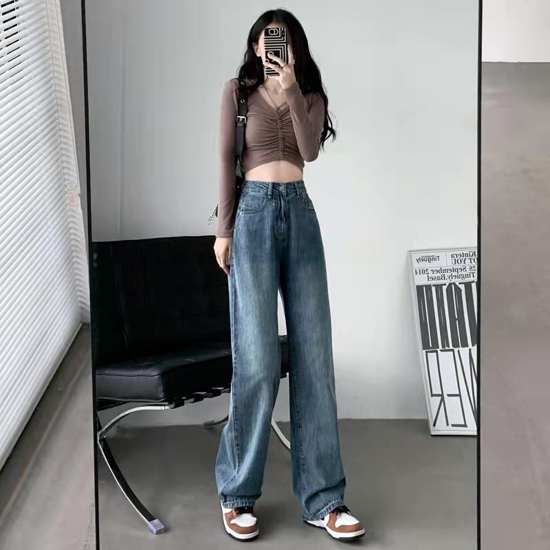 商品名称:自由探戈高腰阔腿裤牛仔裤女春秋装2022新款宽松直筒小个子显瘦拖地裤子加绒可选 浅蓝色(长裤)适合身高159-165 L