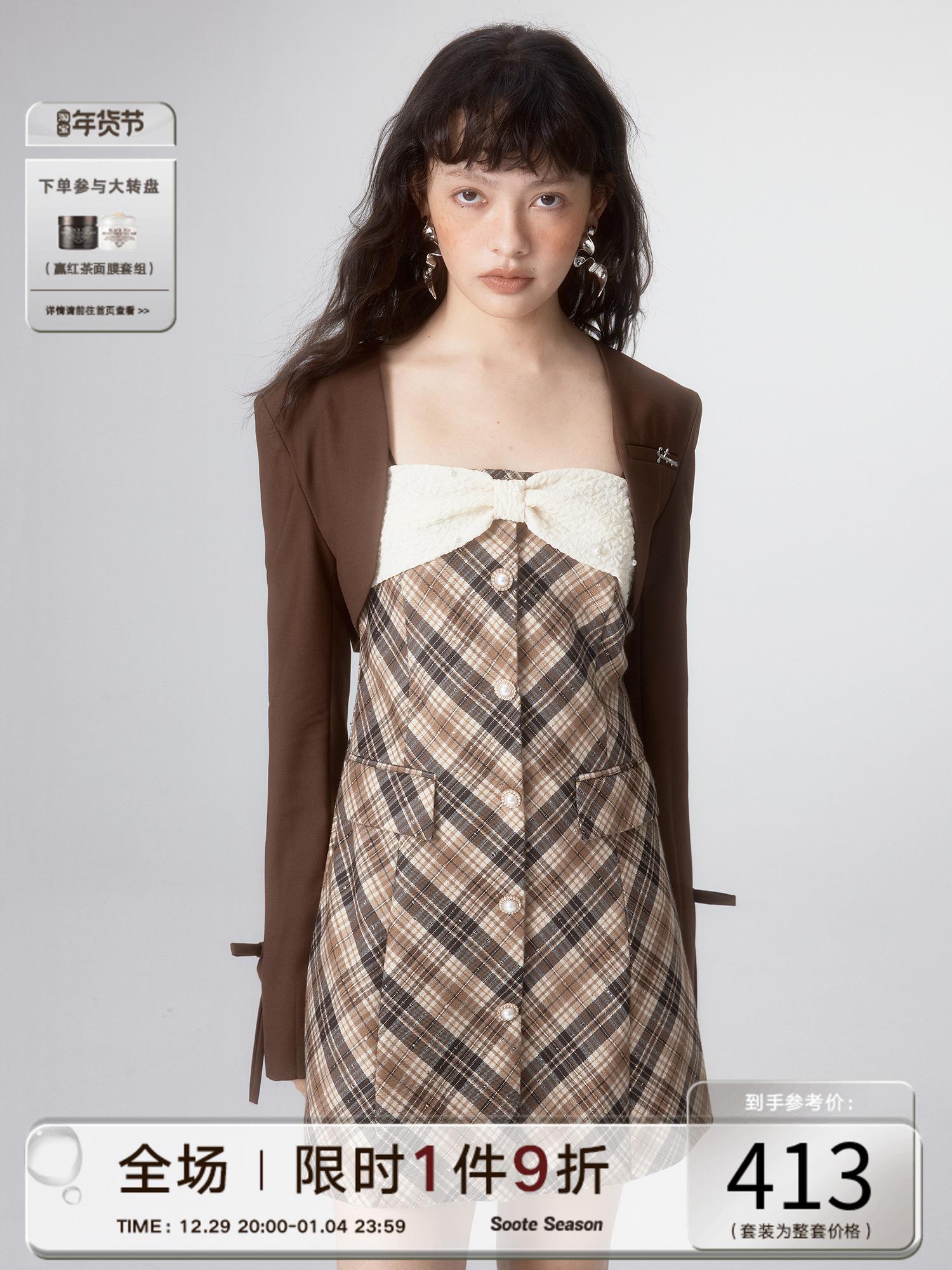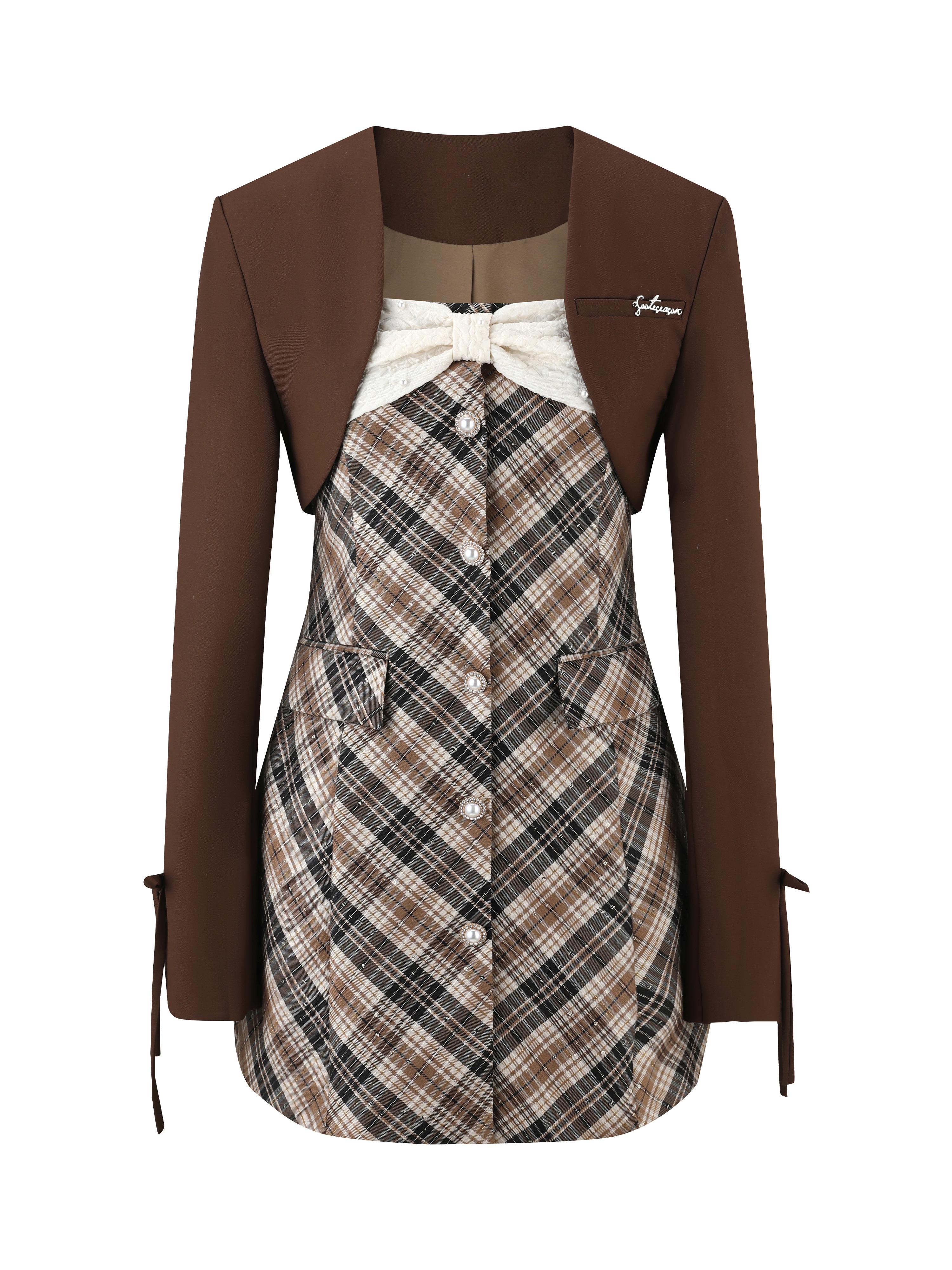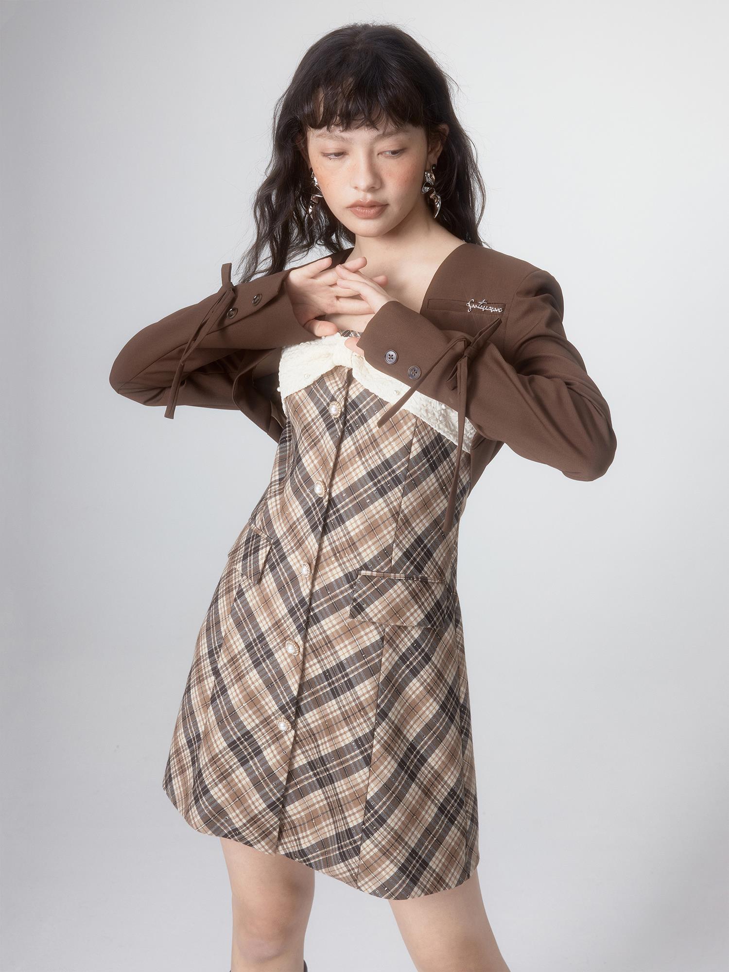 大身棕色格纹浓郁复古,经典学院风中带着几分俏皮;短款修身剪裁,凸显腰身;