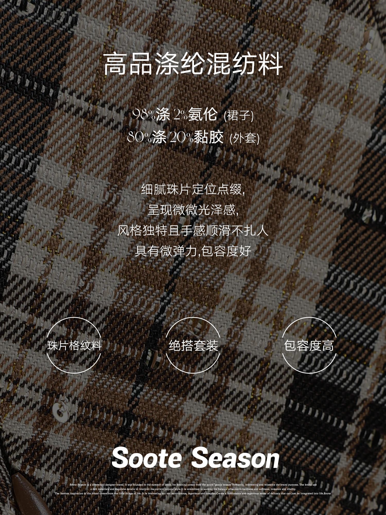 搭配超短款坎肩小外套,剪裁利落挺阔;浓郁焦茶色,打造秋天的氛围感,和内搭棕色格纹呼应,