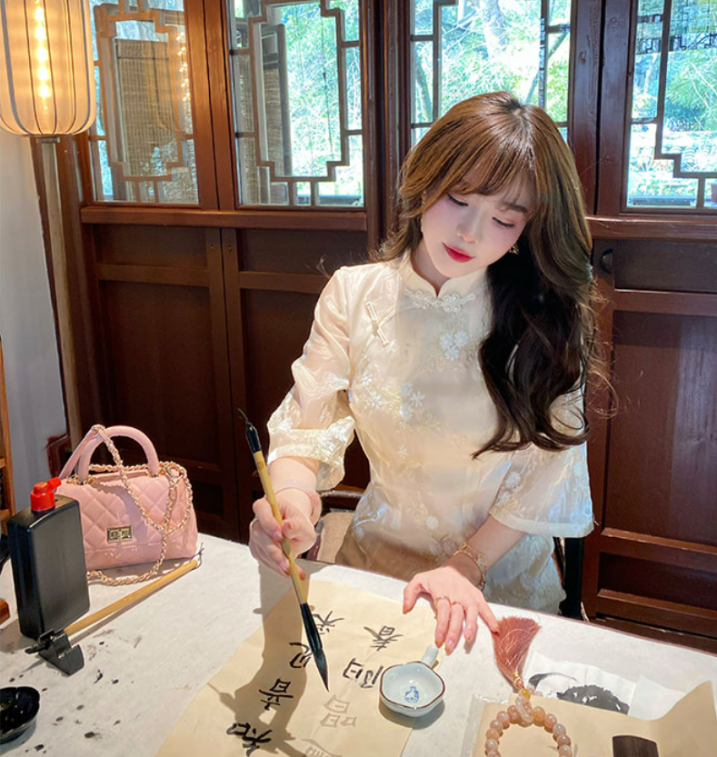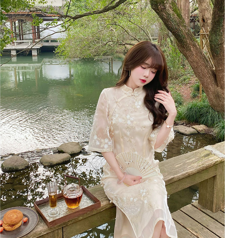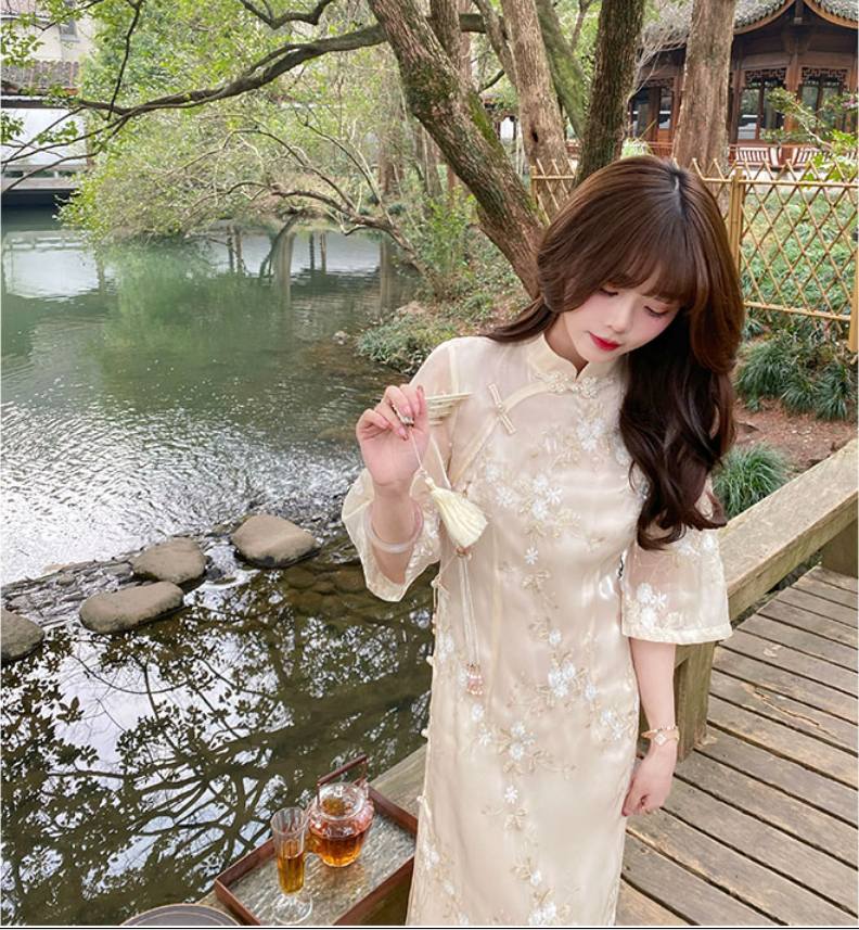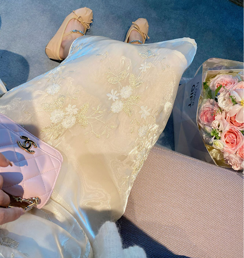 面料是定制的微透珠光纱有细细的光泽感大身和袖子上的国风绣花是我自己设计的图案