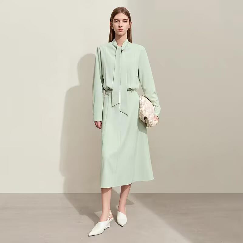 秋新款通勤风雪纺长裙V领绣花绑带修身裙子