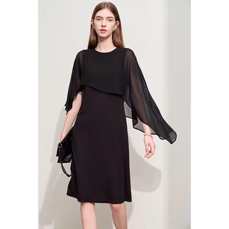 新款优雅圆领撞料拼雪纺连衣裙女修身显瘦收腰小黑裙