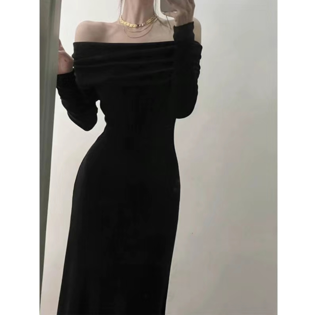 轻奢复古暗黑一字领包臀裙