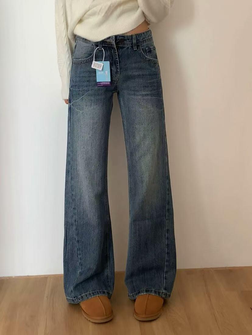 复古水洗蓝牛仔裤女美式高街低腰宽松直筒阔腿拖地