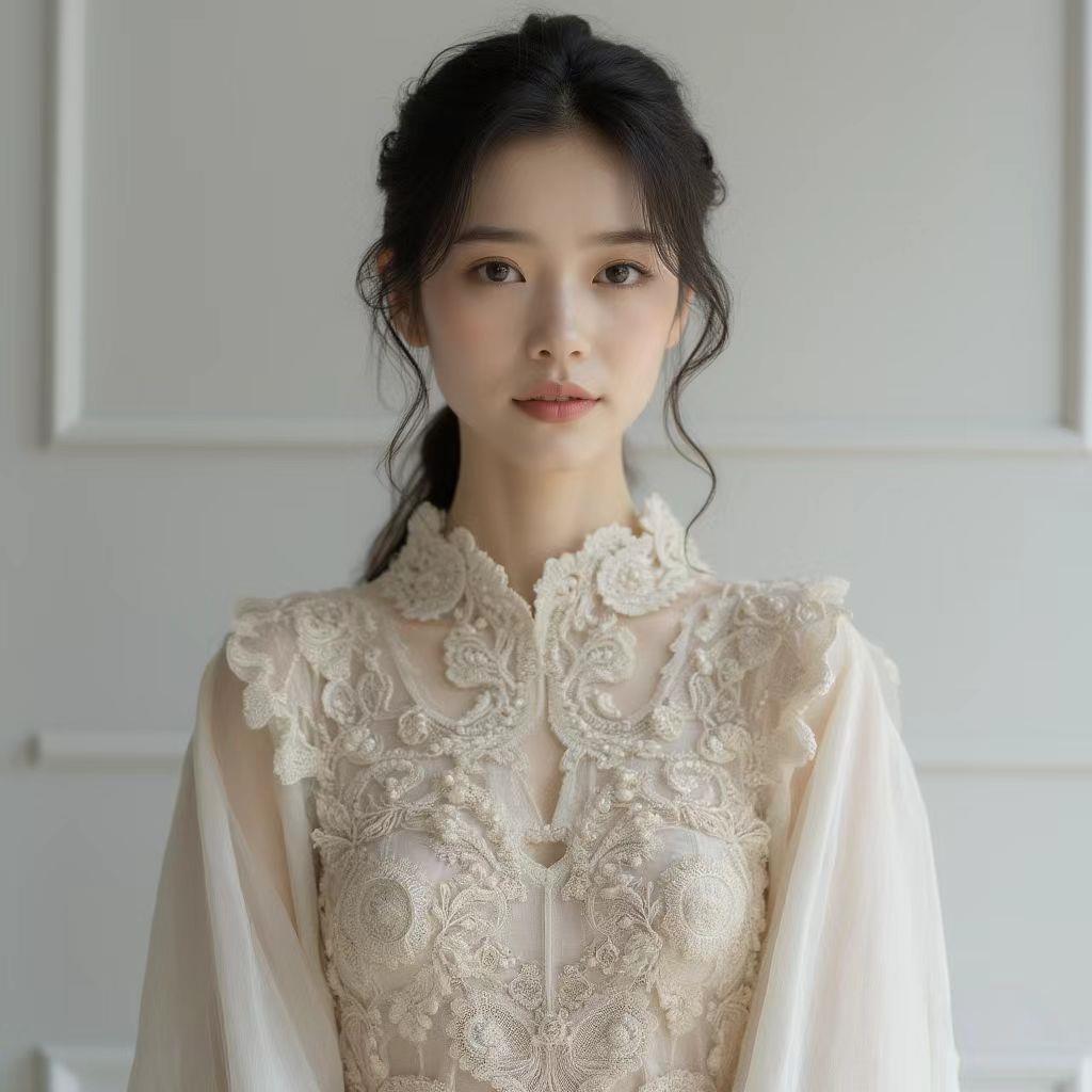 裙身以精湛的手工刺绣工艺点缀,每一针每一线都倾注了匠人的心血。繁复的花卉图案灵感源自古典宫廷艺术,栩栩如生的花朵在裙摆间绽放,仿佛将一座秘密花园穿在身上。刺绣细节采用高定珠光丝线,随着光线的流转,散发出低调而奢华的光泽。