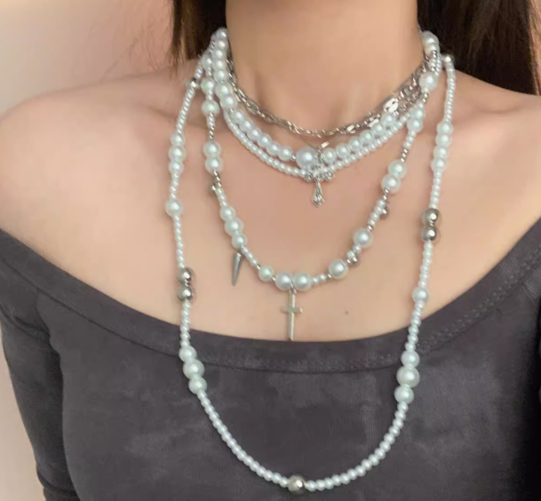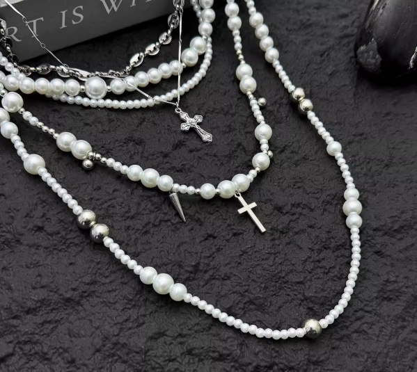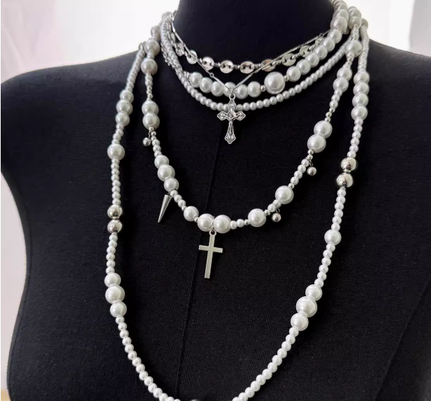 动漫周边 > 服饰 > 珍珠十字架多层叠戴项链不规则颈链多种佩戴方式锁骨链配饰