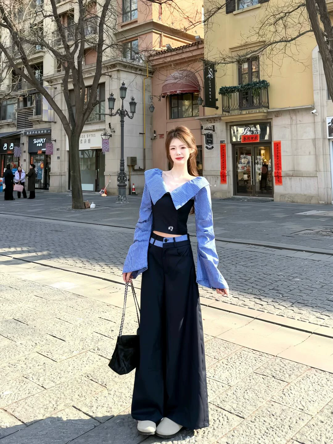 黑色斜肩长袖T恤25年秋假两件格纹拼接撞色美式辣妹风上衣