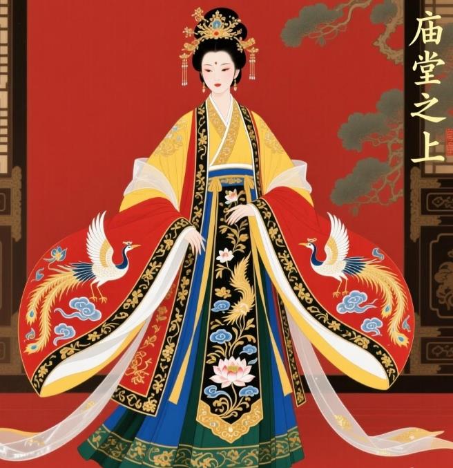 “庙堂之上” 女装汉服在材质选择上兼顾 “质感与仪式感”:优先选用提花锦缎、织金罗纱、真丝混纺等高端面料,提花锦缎质地厚实,纹样立体饱满,适合秋冬及正式场合;织金罗纱轻薄透气,金线光泽柔和,适配春夏穿着;真丝混纺面料垂坠感强,亲肤舒适,同时具备较好的抗皱性,减少打理负担。工艺上传承传统匠心,刺绣采用 “盘金绣”“打籽绣” 等复杂技法,凤凰羽翼、鸾鸟尾羽等细节处针脚细腻,金线与面料衔接自然,无勾丝、脱线问题;马面裙褶裥采用 “高温定型” 工艺,久穿不易散褶,裙门始终保持平整;领口、袖口处均做 “包边处理”,避免面料毛边,提升耐用性。场景适配性极强:适合传统节日庆典(如春节、中秋)穿着,尽显节日仪式感;可用于汉服文化展演、宫廷主题活动,贴合场合调性;也可作为婚礼敬酒服、传统礼服,既有东方美学特色,又不失庄重正式;即使是汉服资深爱好者的收藏,其合规的形制与精湛工艺也极具价值,满足不同用户对 “仪式感汉服” 的需求。