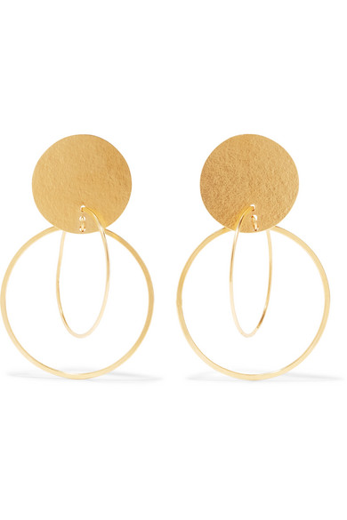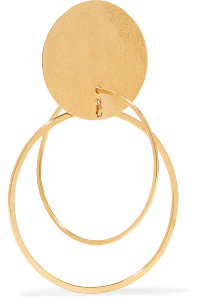 这款 “Halo” 金色耳环以手工将大号圆盘与纤细的圈环组合在一起,对比鲜明的尺寸营造出时髦之感。可搭配色彩鲜艳的服装。