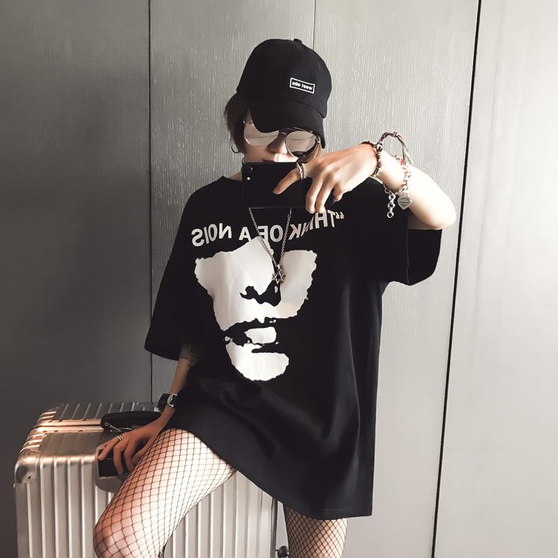 服饰箱包、运动户外 > 夹克 > 2017春装新款宽松休闲抽象头像字母印花大版短袖T恤中长款女装潮