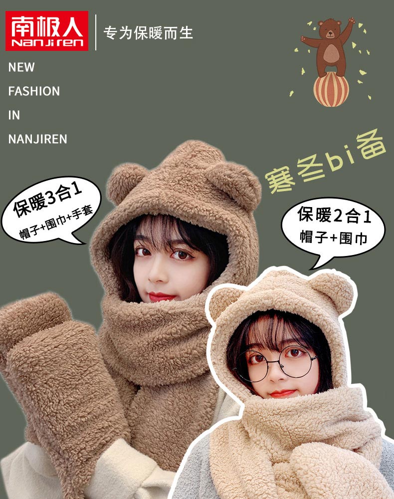 小熊帽子新款2020网红秋冬季围巾女士防风连帽一体百搭三件套耳朵