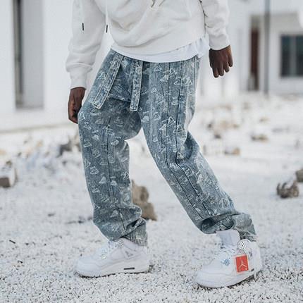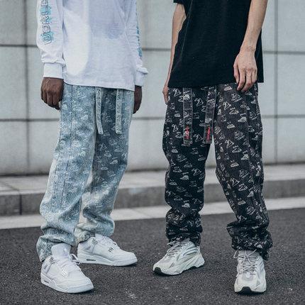 动漫周边 > 服饰 > PRBLMS潮牌个性满印牛仔裤嘻哈国潮宽松长裤重工水洗做旧裤子男女