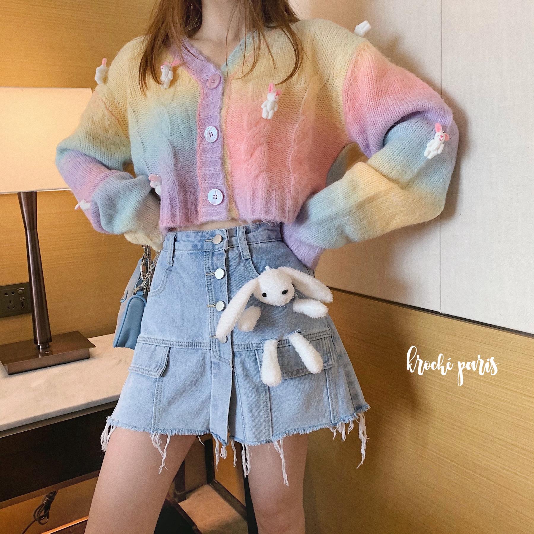 动漫周边 > 服饰 > Kroche春夏新款可爱立体兔兔高腰A字牛仔裙裤不规则短裙