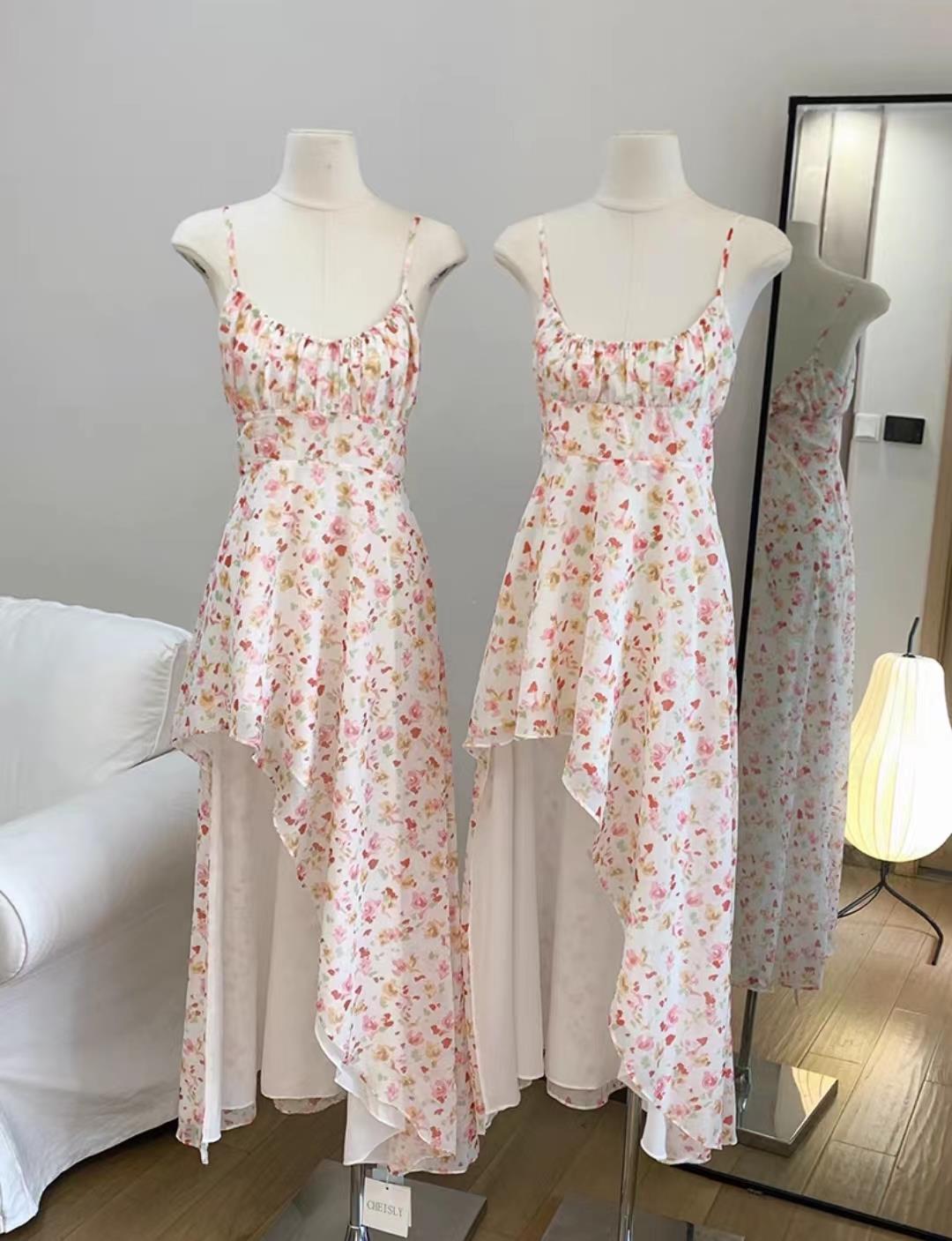 2024年立体花卉碎花连衣裙夏季新款斜下摆收腰长裙吊带裙