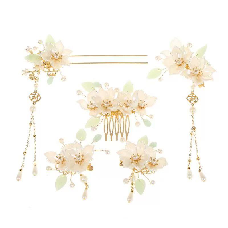 仙气漂亮的古风发饰,山茶花造型,材质为玉珠和树脂,包括发钗、发梳、一对边夹