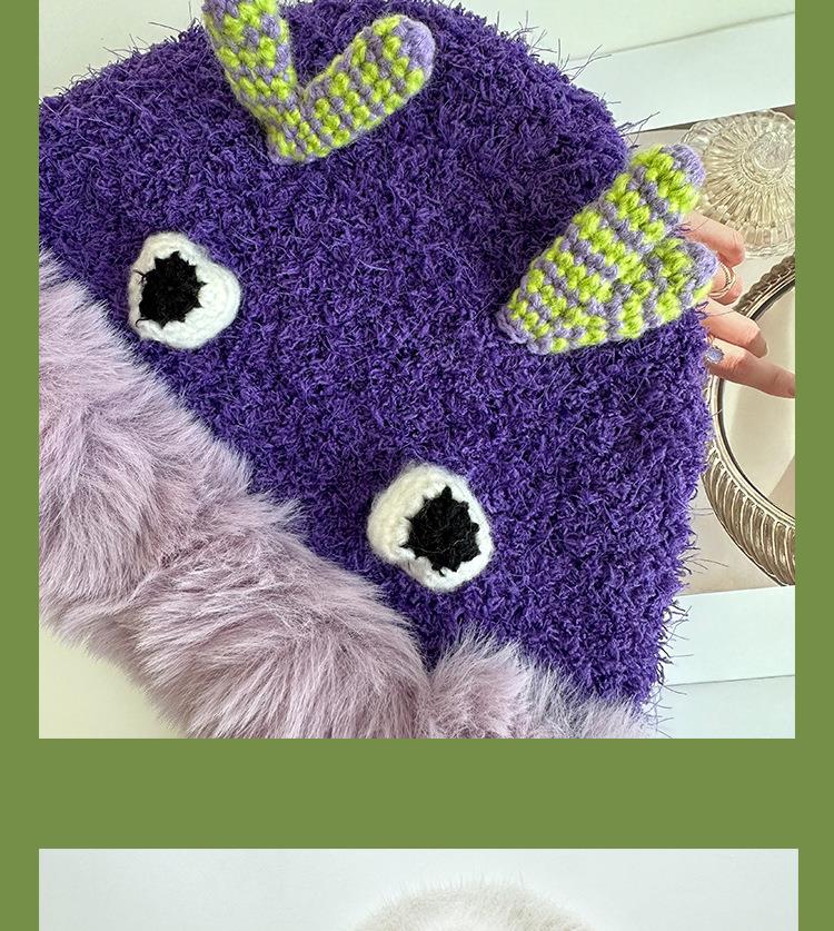 以下是日系搞怪可爱小怪兽毛绒套头帽子女秋冬季加厚保暖- 款式设计:帽子以搞怪可爱的小怪兽为设计元素,充满童趣和创意。有多种颜色和造型可选,如紫色龙角、三角怪湖蓝紫牙等,满足不同个性需求 。