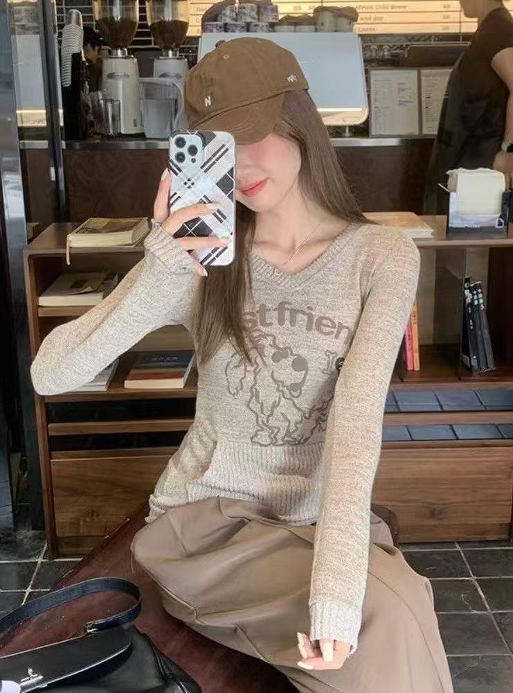 韩系甜妹秋冬氛围感V领连帽长袖针织打底衫修身显瘦上衣