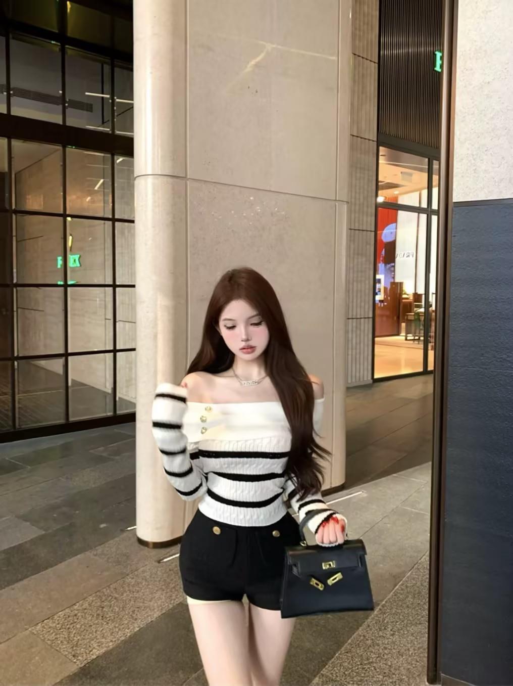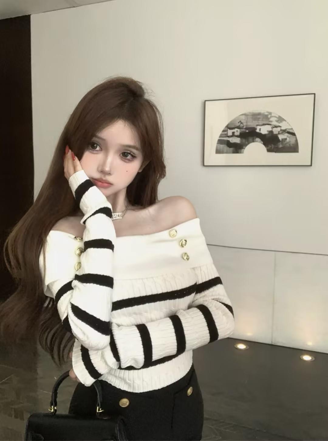 商品特点:一字肩黑白条纹,小香风短款毛衣,收腰修身,纯欲风格,适合冬季穿着,时尚优雅。产品描述:采用优质针织面料,黑白条纹经典搭配,一字肩设计展现迷人锁骨,收腰剪裁凸显身材曲线,短款版型更显高挑。