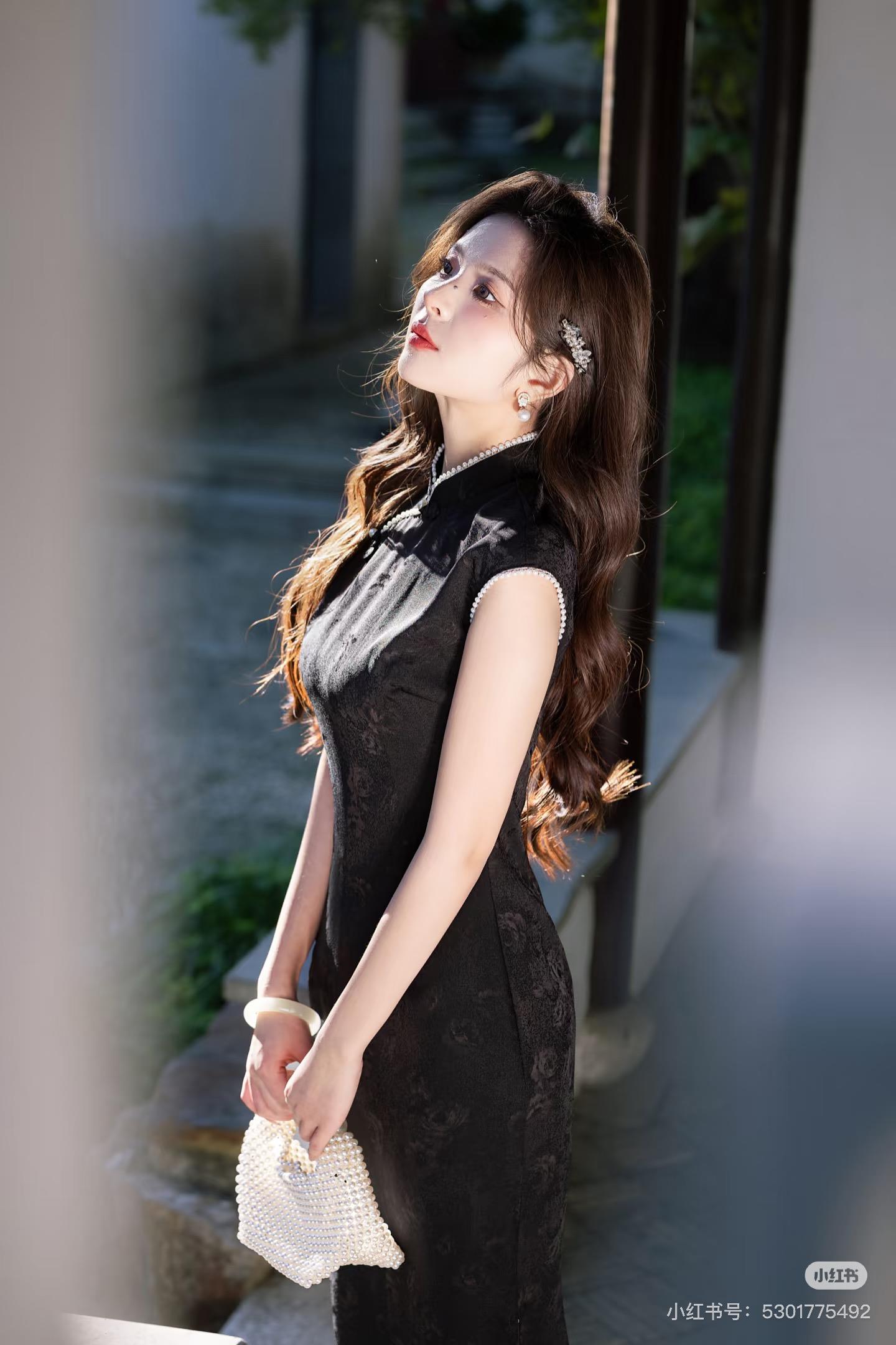 夜色凝成衣上诗,16姆米重磅桑蚕缎流转着星芒般的哑光,领襟处银丝刺绣昙花于暗处生辉,下摆错落排列的三角绲边恰似月下竹影。改良水滴领设计微露锁骨风情,后腰暗藏鱼骨塑形却不显束缚,让古典廓形与现代穿着舒适度达成微妙平衡。