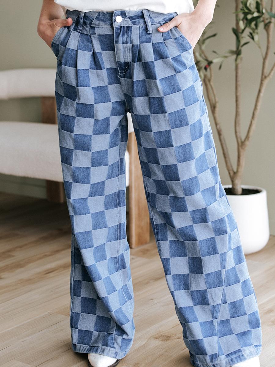 欧美个性潮流棋盘格印花牛仔裤女 2025秋季新款高腰宽松阔腿裤女