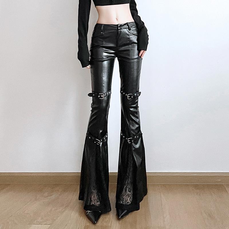 猎奇原创暗黑特工#甜酷辣妹蕾丝微喇裤机能感金属扣小众pu皮裤女